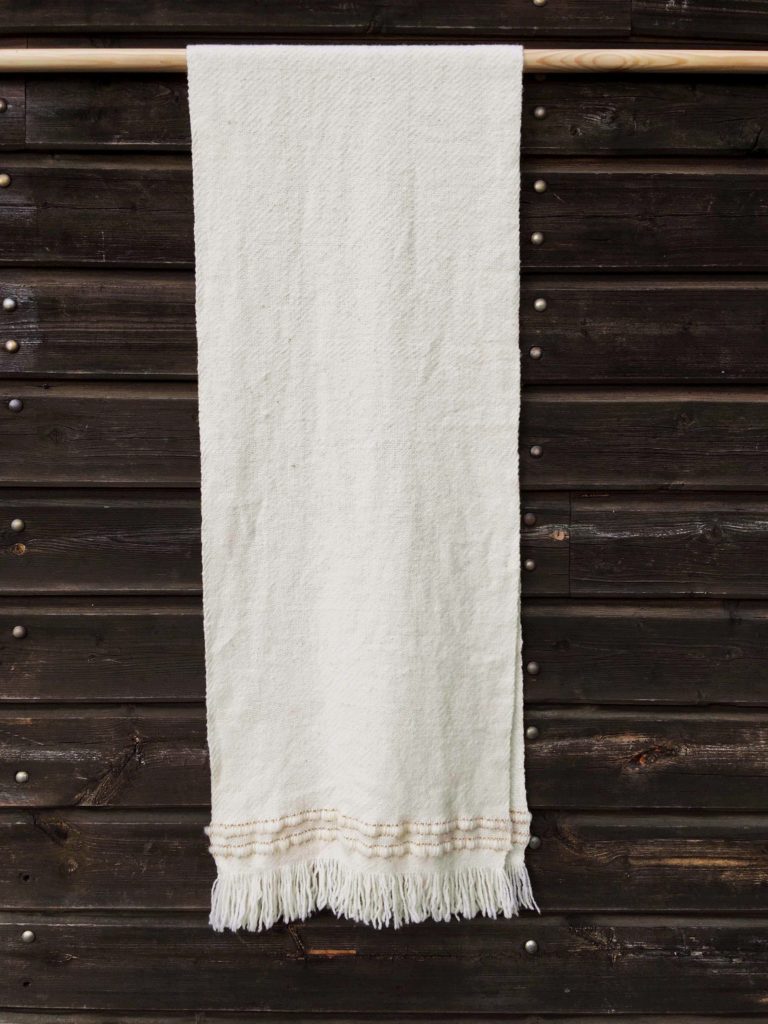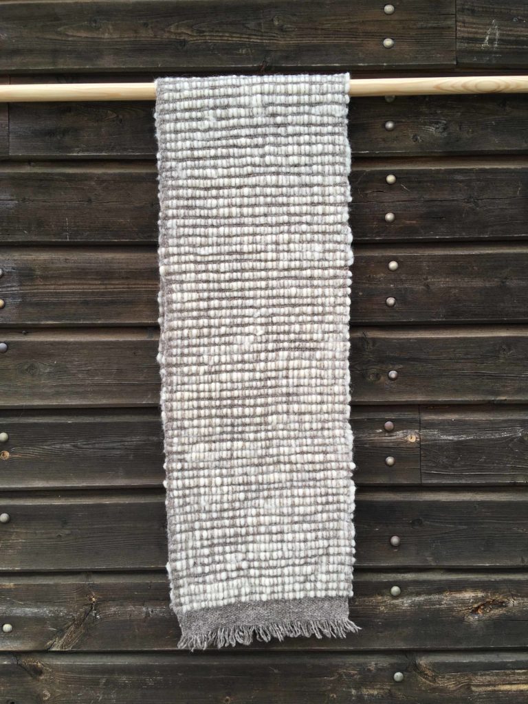 Pour ces écharpes nous avons choisi une technique simple utilisée depuis la naissance du tissage, qui met en avant les jolies irrégularité du fil et joue avec le caractère primitif de cette laine.